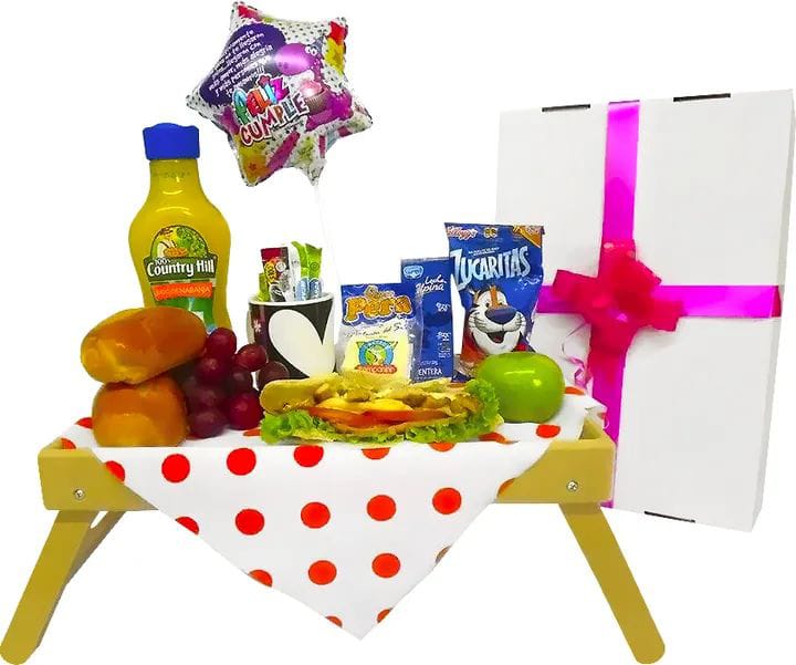 Envío gratis1.Hermosa bandeja de madera con patas, 2.Caja decorada, Mantel individual, 3.Sándwich gourmet, 4.Jugo 5.country hill, 6.Mug según disponibilidad, 7.Queso pera, 8.Leche alpina, 9.Kellogs, 10.2 panes, 11.Manzana, 12.Uvas, 13.Sobre de café, 14.Sobre de azúcar, 15.Cubiertos, 16.Globo metalizado 9 pulgadas según disponibilidad del cliente.