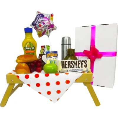 Hermosa bandeja de madera con patas, Caja decorada, Mantel individual, Termo hermético con bebida caliente (milo o chocolate)Tamal caliente, Jugo country hill, Mug según disponibilidad, 2 panes, Sobre de café, Sobre de azúcar, Chocolatina hersheys, Uvas, Manzana, Queso pera, cubiertos, Globo metalizado 9 pulgadas según disponibilidad del cliente