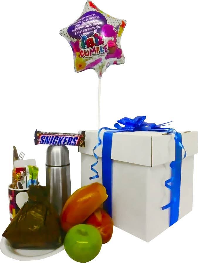 Caja de regalo decorada, Termo hermético, 2 panes, Mug según disponibilidad de la empresa, Azúcar, Café, Chocolatina snickers, Manzana, Cubiertos Globo metalizado 9 pulgadas según disponibilidad del cliente